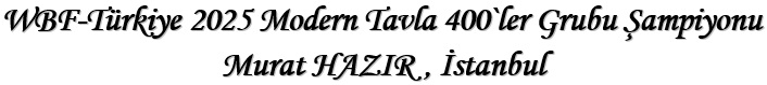IV. Elit Tavla Spor Kulübü Derneği üyelerine özel 2025 Elit Master Aktivitesi`nde şampiyon olmak: 2025 döneminde WBF-Türkiye faaliyetlerinde belli derecelere ulaşan Elit Tavla Spor Kulübü Derneği üyelerine yönelik düzenlenen dönem sonu aktivitesi Elit Master`da şampiyonluğa ulaşan oyuncu, ilgili dönemin "WBF-Türkiye Elit Master Şampiyonu" sıfatıyla Ana Eşleşme Tablosu`na doğrudan katılmaya hak kazanır. V. Modern Tavla Genel Sıralaması`nda dönem sonundaki yerleşimlere göre davetle iştirak edilebilen 2025 Modern Tavla 400`ler Grubu Aktivitesi`nde şampiyon olmak: WBF-Türkiye Modern Tavla Genel Sıralaması`nda "Experience (Tecrübe)" faktörü asgari 400 olmak yanında 2025 dönemi boyunca en az iki lig sezonuna iştirak etmiş isimler arasında en yüksek ELO puanına sahip ilk 24 oyuncunun davet edildiği ve bu isimlerin aralarındaki sıralamaya göre kendiliğinden Eşleşme Tablosu`na yerleştikleri Modern Tavla 400`ler Grubu Aktivitesi`nde şampiyonluğa ulaşan oyuncu, ilgili dönemin "WBF-Türkiye Modern Tavla 400`ler Grubu Birincisi" sıfatıyla Ana Eşleşme Tablosu`na doğrudan katılmaya hak kazanır.